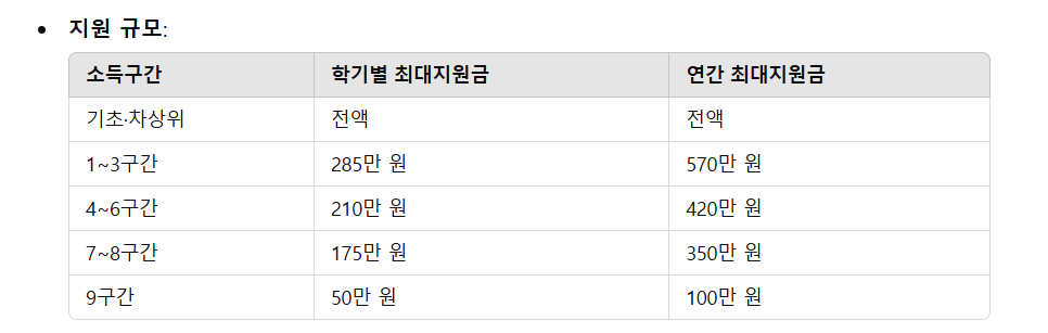 - 지원 대상: 소득구간 9구간 이하 대학생, 성적 기준(80점 이상) 충족.