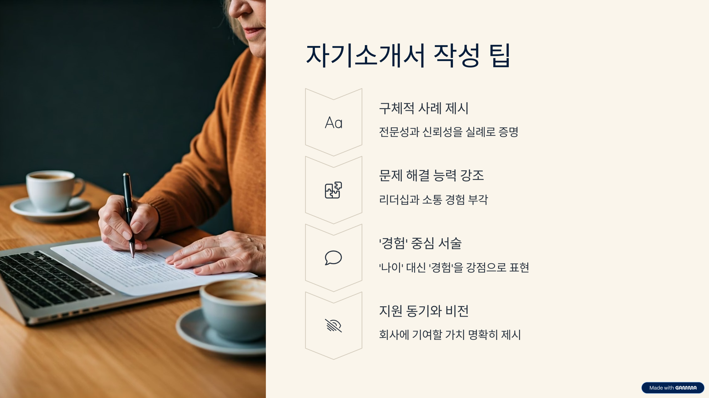 자기소개서는 '내 얘기를 말하되, 회사에 도움이 될 이야기'를 해야 합니다. 가장 효과적인 구조는 '과거-현재-미래' 순입니다.