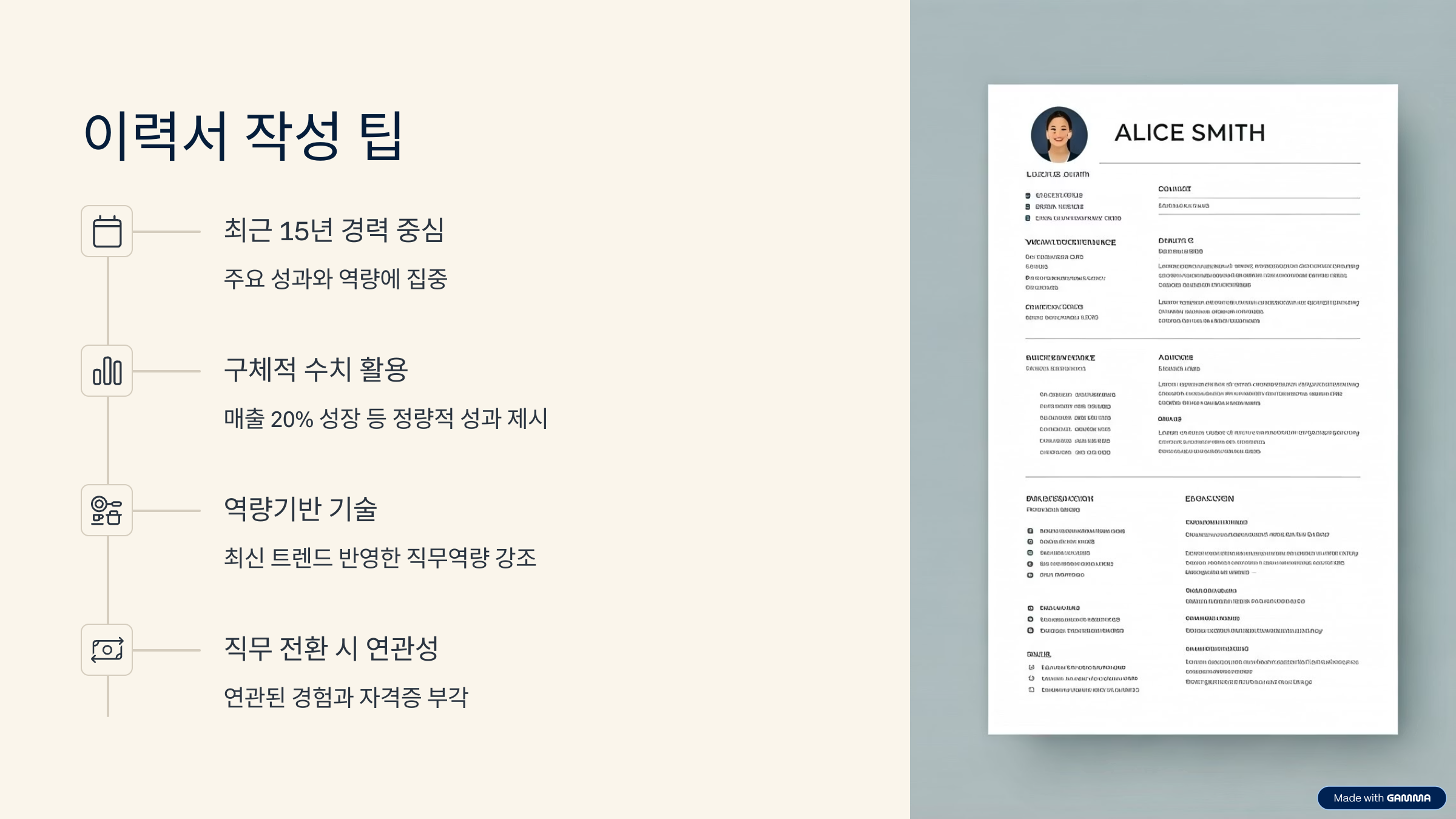 Tip: 근무 공백이 있다면 이유를 간단히 설명하고, 그 시간에 배운 점이나 활동한 내용을 연결해보세요.