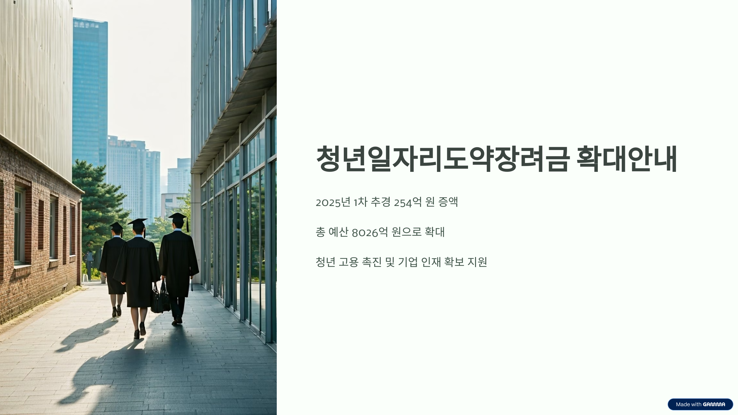 청년일자리도약장려금은 중소기업이 취업애로 청년을 채용할 경우 정부가 일정 금액을 지원하는 제도입니다. 이번 추가경정예산을 통해 254억 원이 추가 편성되며 총 예산이 8026억 원으로 늘어났습니다. 특히, 대학교 졸업예정자 7000명이 새롭게 지원 대상에 포함되어 총 10만 7000명의 청년이 혜택을 받게 됩니다.