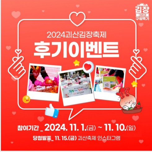 이번 2024괴산김장축제에는 다양한 온라인이벤트도 준비되어 있으니 참가해보셔서 행운을 가져가보세요~