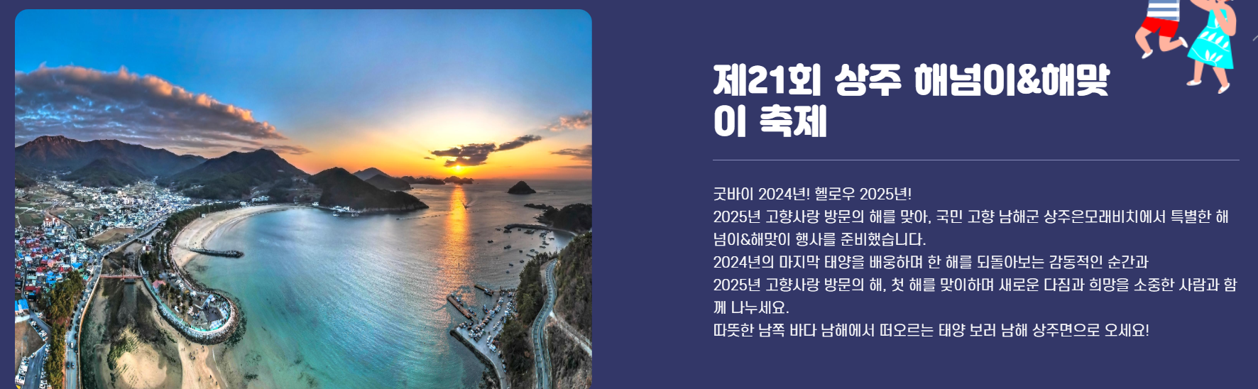 상주 해돋이&물메기 축제는 남해의 아름다운 자연과 지역 특산물을 함께 즐길 수 있는 특별한 행사입니다. 가족, 친구들과 함께 새해의 시작을 남해에서 맞이해보세요.