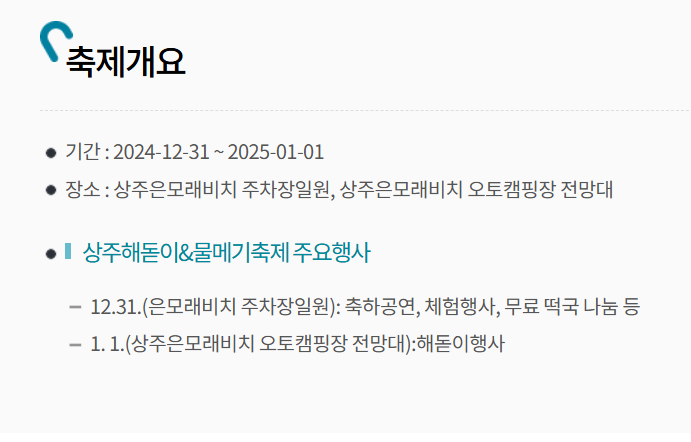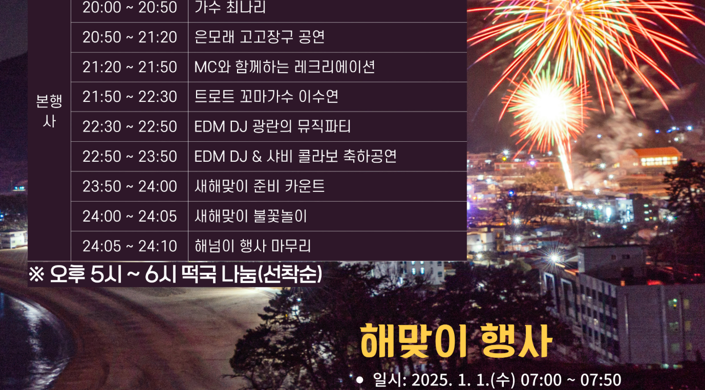 - 추천 시간대: 12월 31일 오후부터 방문하여 축제 분위기를 만끽하고, 새벽에는 일출을 감상하시길 권장합니다.