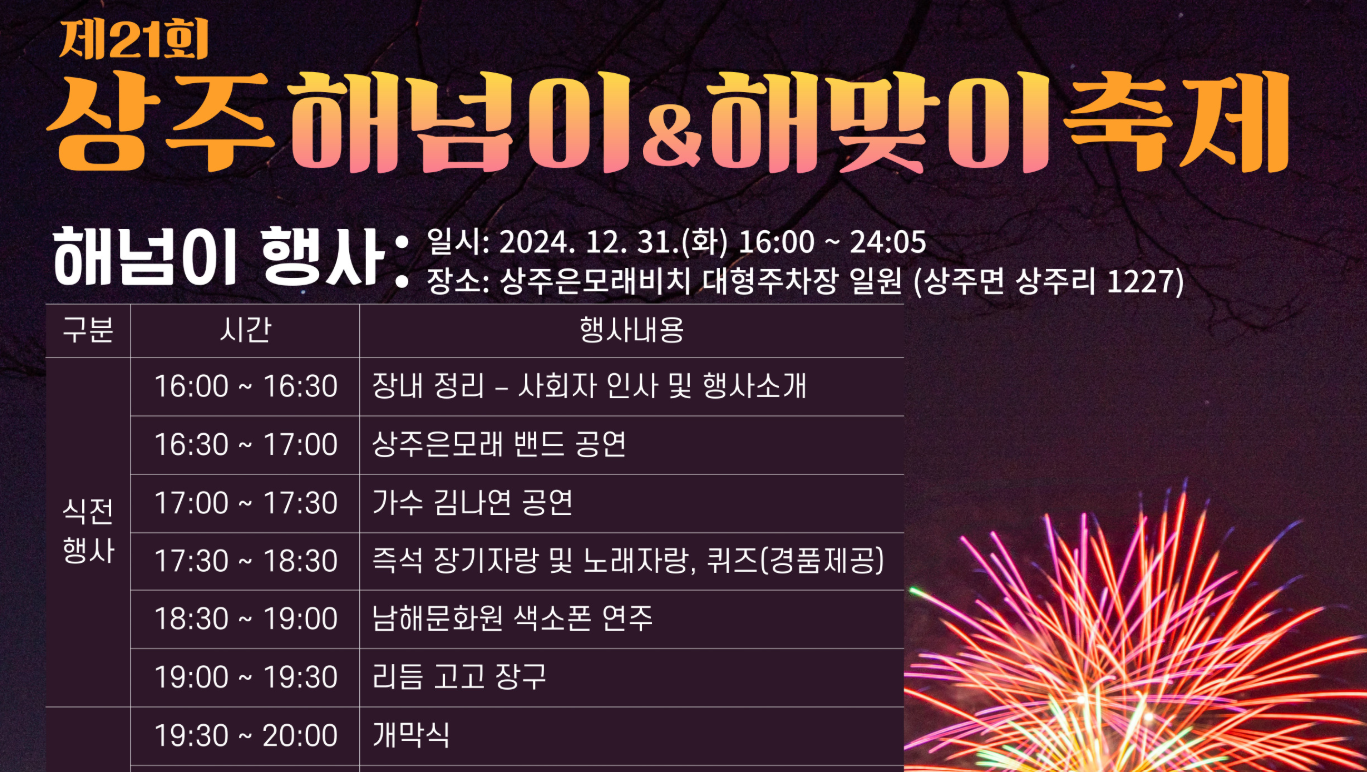 - 주의사항: 겨울철 해안가의 날씨는 변덕스러울 수 있으므로, 기상 상황을 사전에 확인하고 안전에 유의하세요. 또한, 행사 기간 동안 많은 인파가 예상되므로 질서를 지켜주시기 바랍니다.