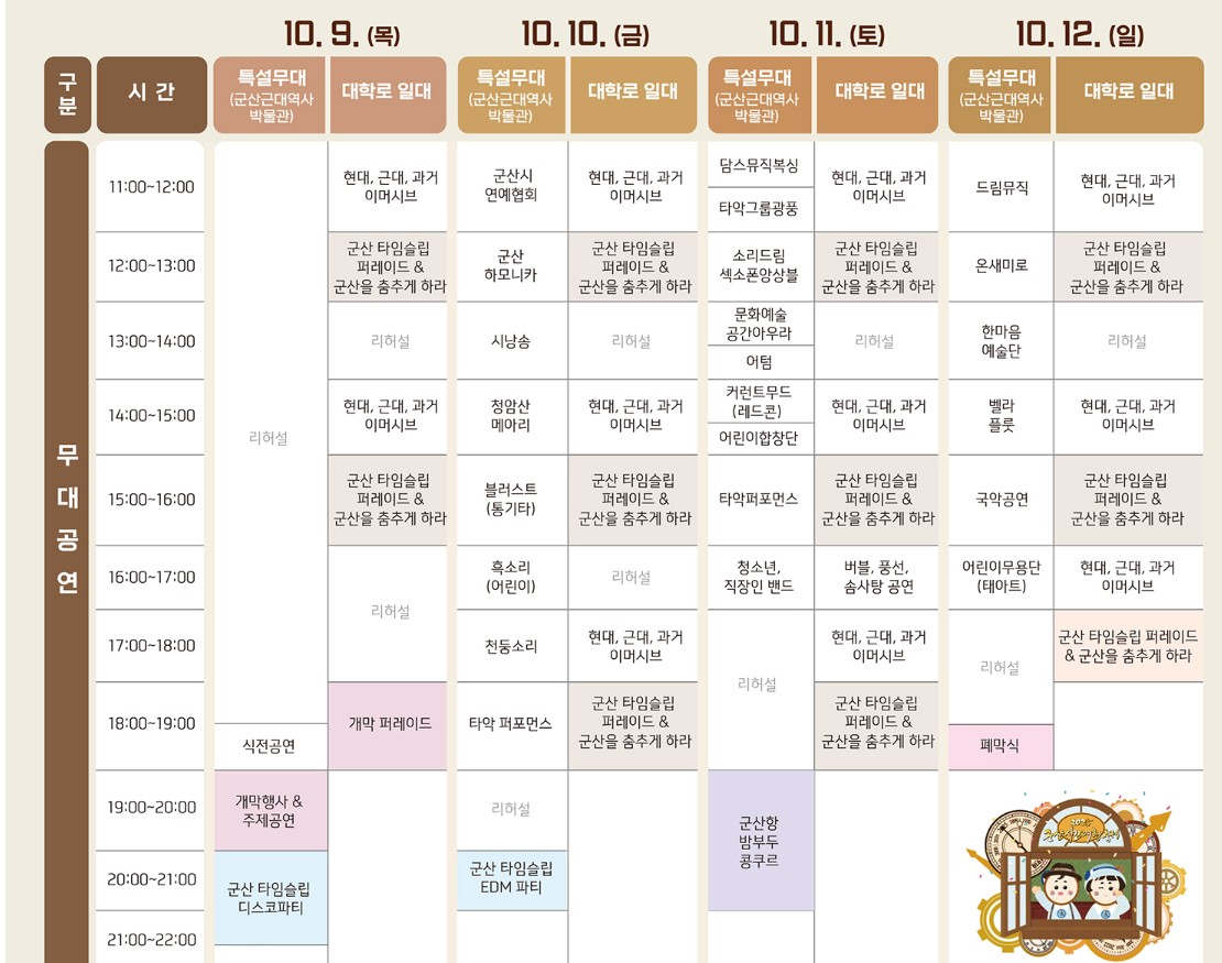 - 주요 프로그램: • 타임슬립 퍼레이드 (일 2~3회) • 미디어아트 외벽 공연 • 군산항 밤부두 콩쿠르 • 디스코/EDM 파티 • 독립자금을 찾아라 미션 게임 • AR / QR 이벤트, 모아모아시간 참여형 콘텐츠 • 영화 명소 투어 (초원사진관, 해망굴 등) • 군산짬뽕 페스티벌 연계 행사