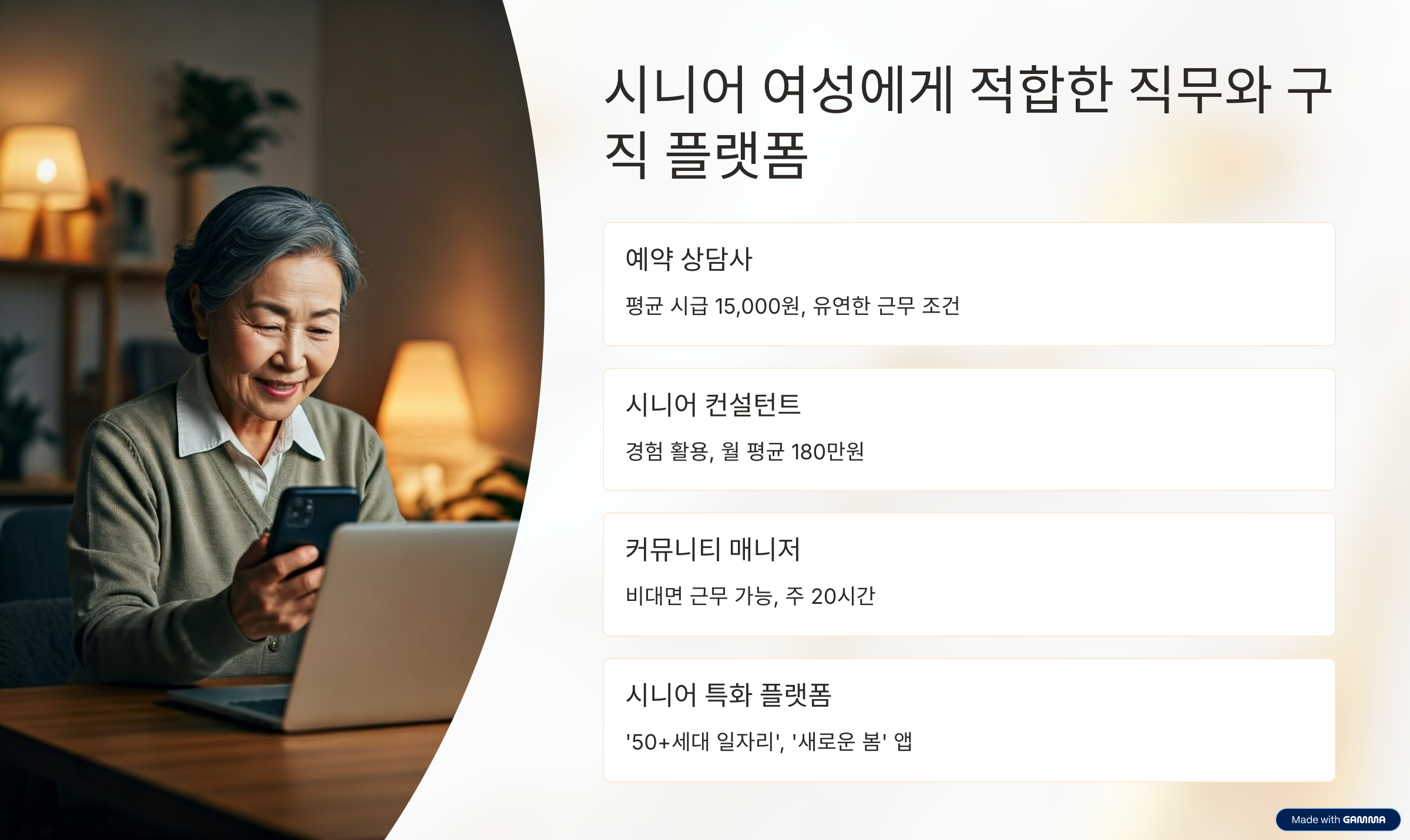 일반 구직 사이트는 젊은 층 중심이라 공감도 떨어지고, 원하는 조건과 동떨어진 채용 정보가 많습니다. 따라서 시니어 여성에게 특화된 전용 플랫폼을 활용하는 것이 시간과 에너지를 절약하는 지름길입니다.