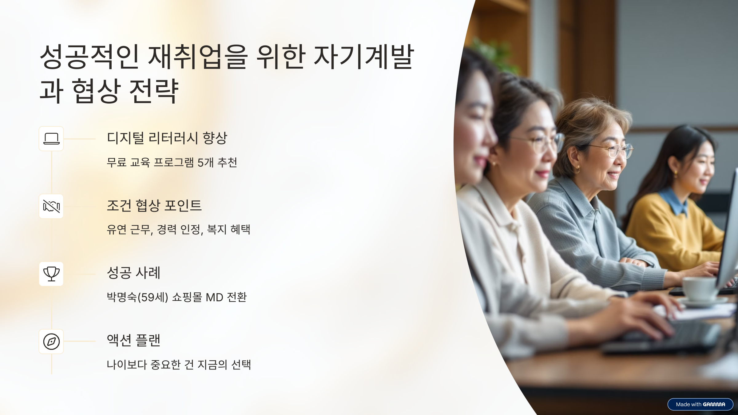 나이 들수록 경쟁력이 떨어진다는 편견을 깨는 가장 좋은 방법은 ‘계속 배우는 자세’입니다. 최근에는 여성 시니어를 위한 무료 교육도 많아졌고, 간단한 온라인 교육도 구직 활동에 큰 도움이 됩니다.